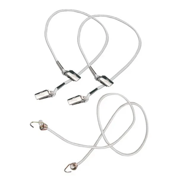 Jeu de 3 tendeurs pour housse. 1 Sandow de 90cm à placer au niveau de l’articulation du dossier/siége d’un fauteuil de soins. 2 Tendeurs à pinces de 50cm pour tendre le tissu sur le fauteuil.