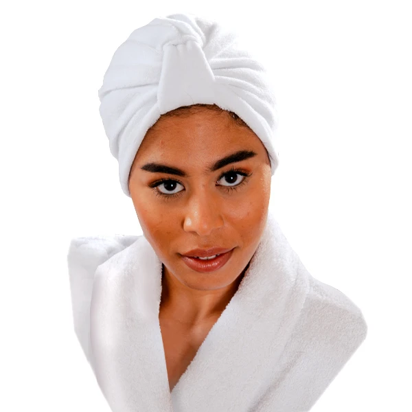 Bonnet de protection blanc en éponge, ultra-absorbant. Ce bonnet permet un séchage rapide des cheveux grâce à sa matière qui absorbe très efficacement.
